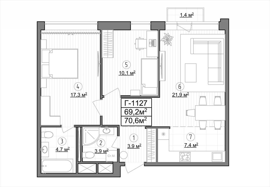 общая 70,6 м2, жилая 49,3 м2, кухни 7,4 м2 |