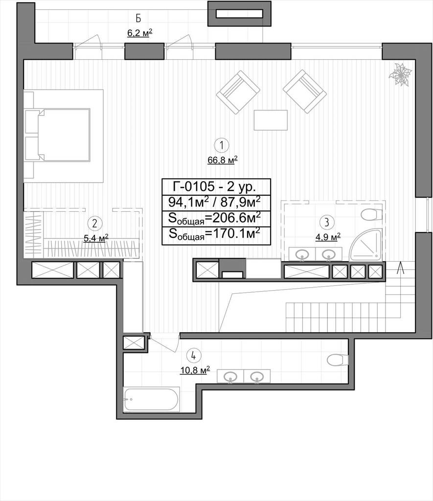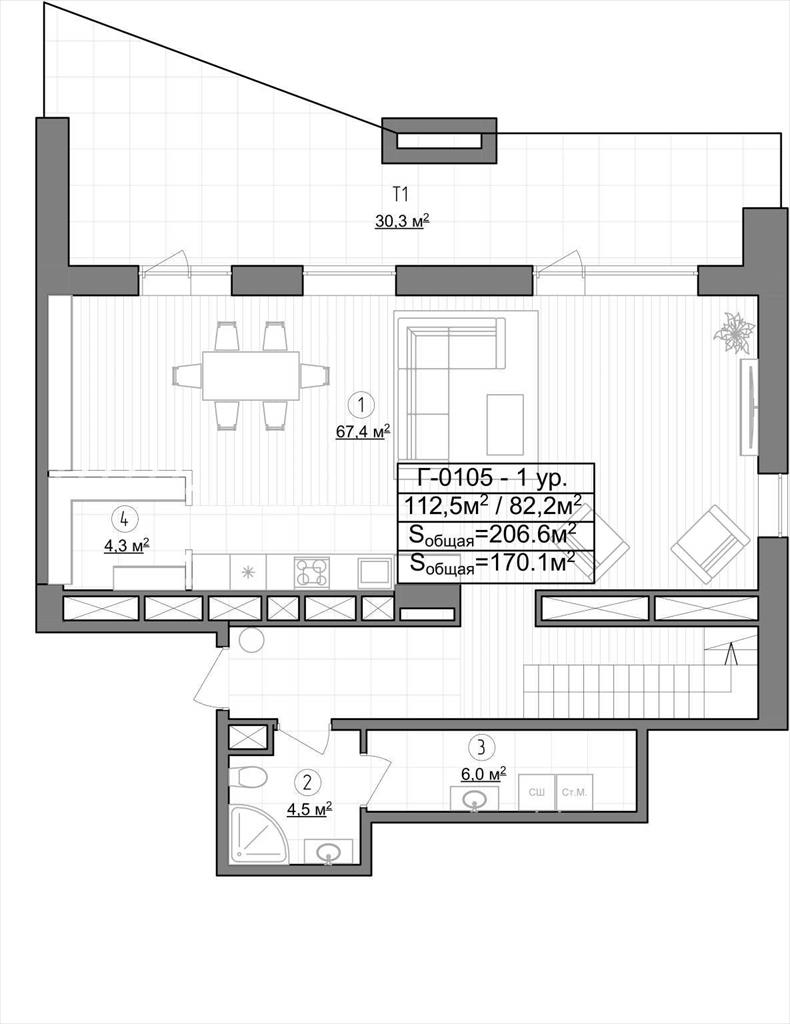 общая 206,6 м2, жилая 66,8 м2, кухни 67,4 м2 |