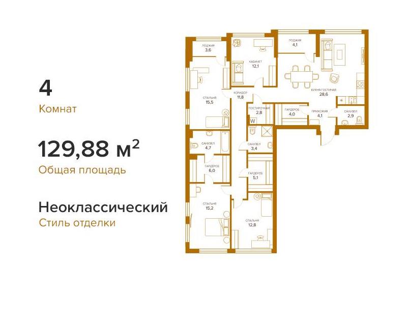 Общая площадь квартиры - 129.88 кв.м. В квартире выполнена премиальная отделка в неоклассическом стиле.