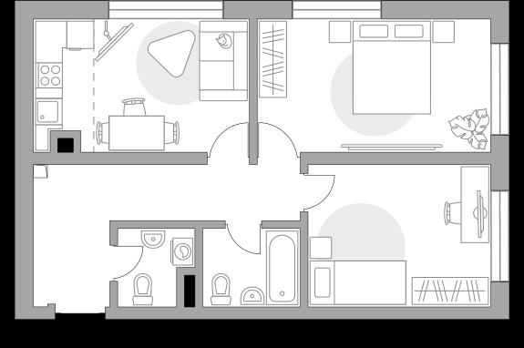 общая 57,44 м2, жилая 36,92 м2, кухни 3,47 м2 |
