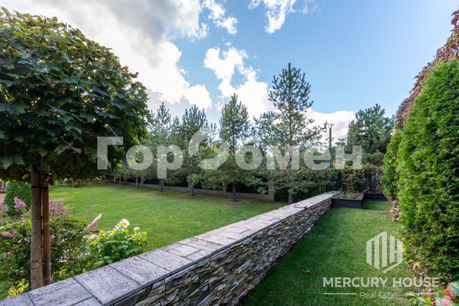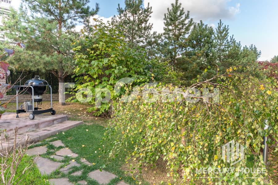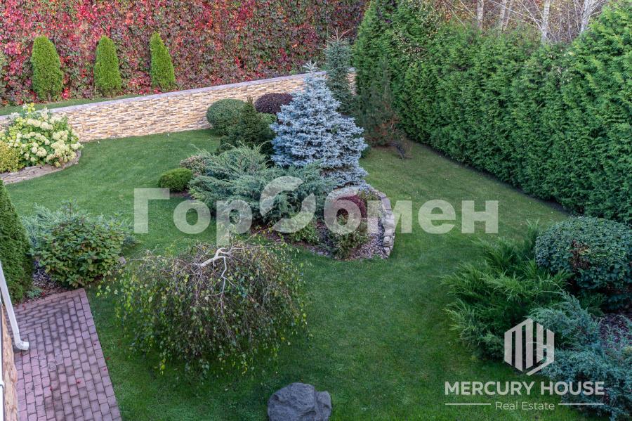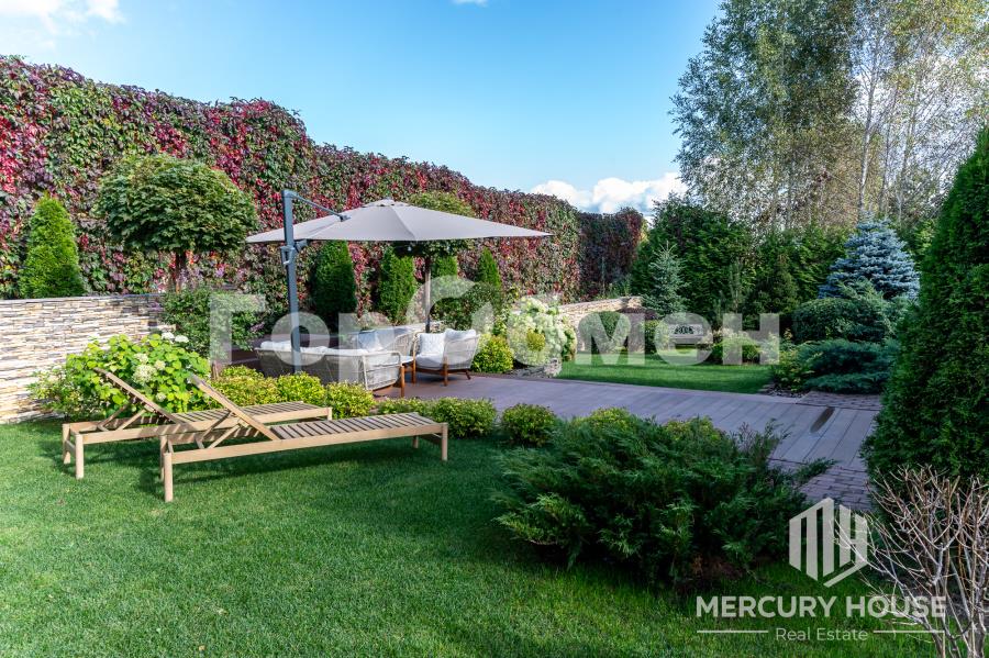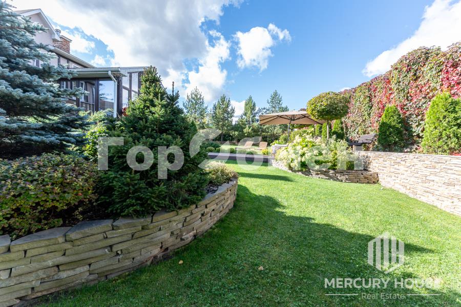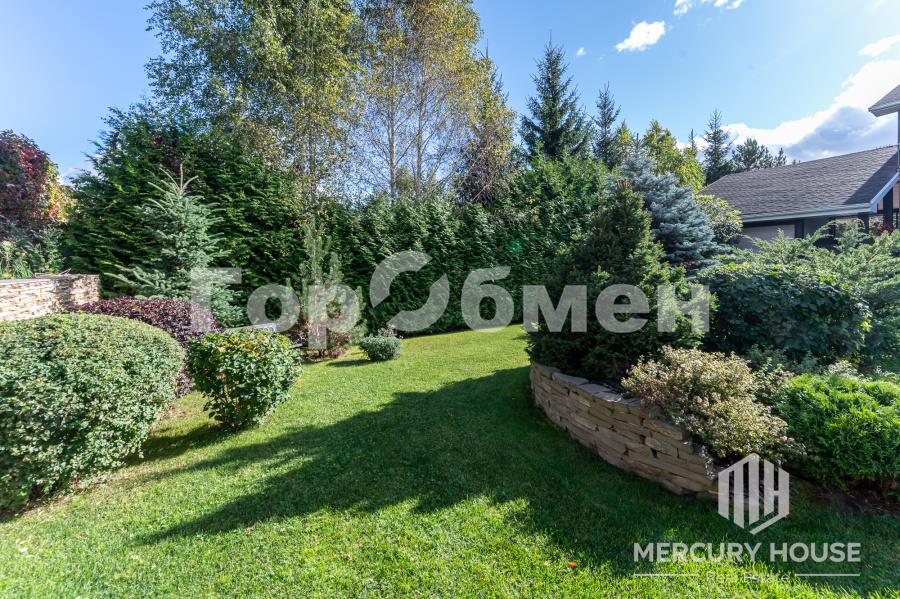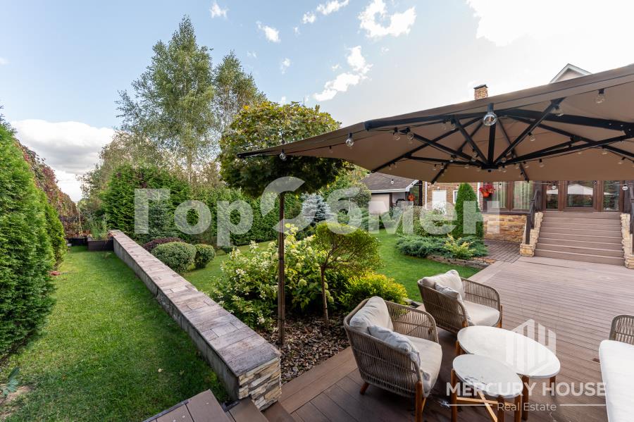 На участке выполнен КРАСИВЫЙ ЛАНДШАФТНЫЙ ДИЗАЙН: газон, множество деревьев, цветов и кустарников, дорожки из брусчатки, уличное освещение. Выделенная зона барбекю.