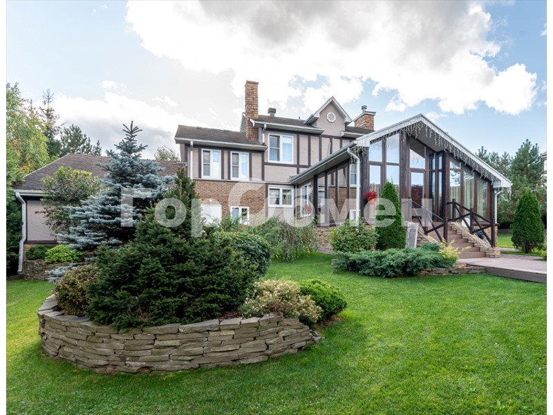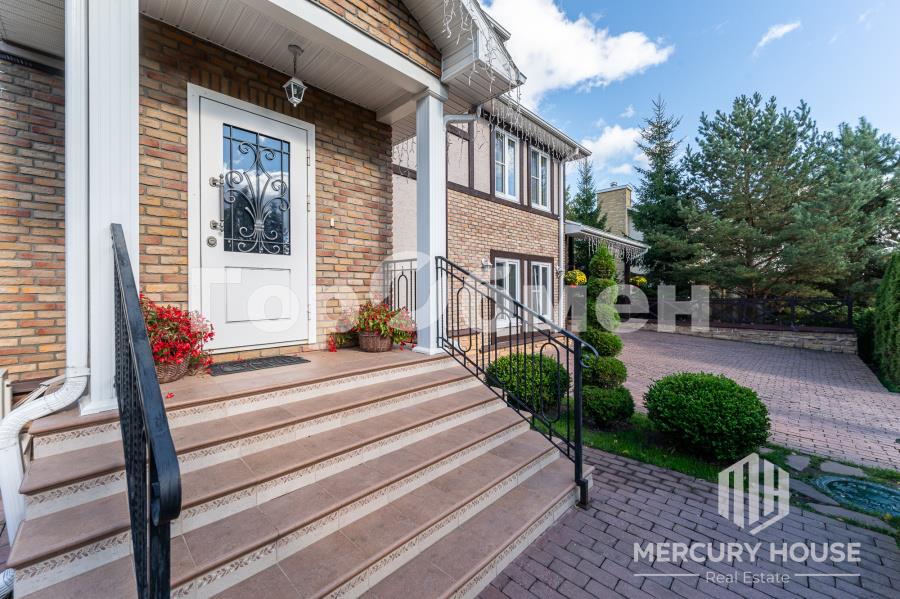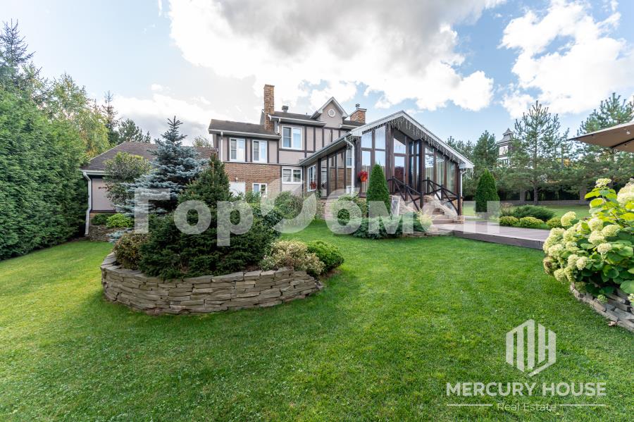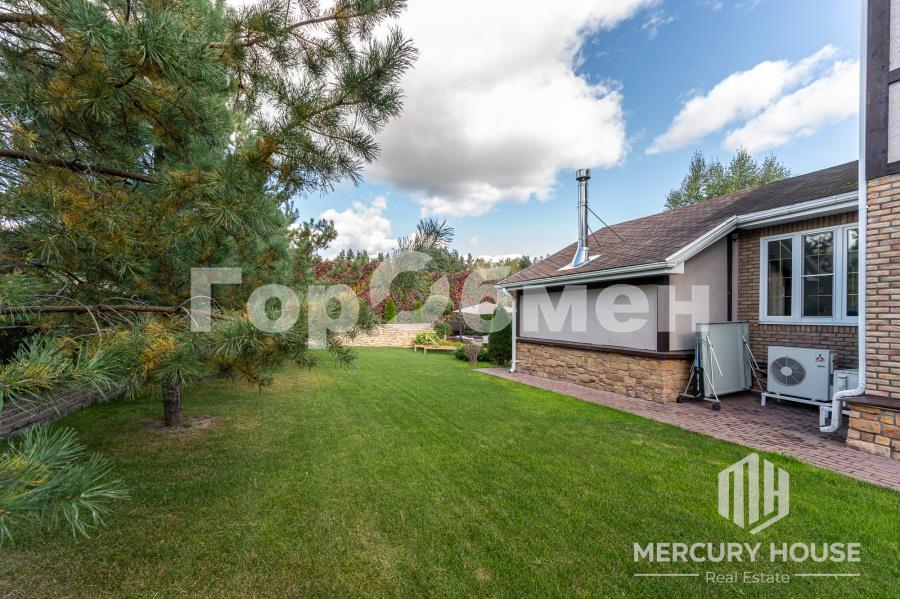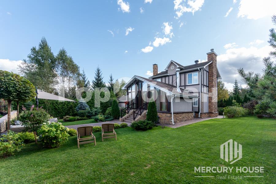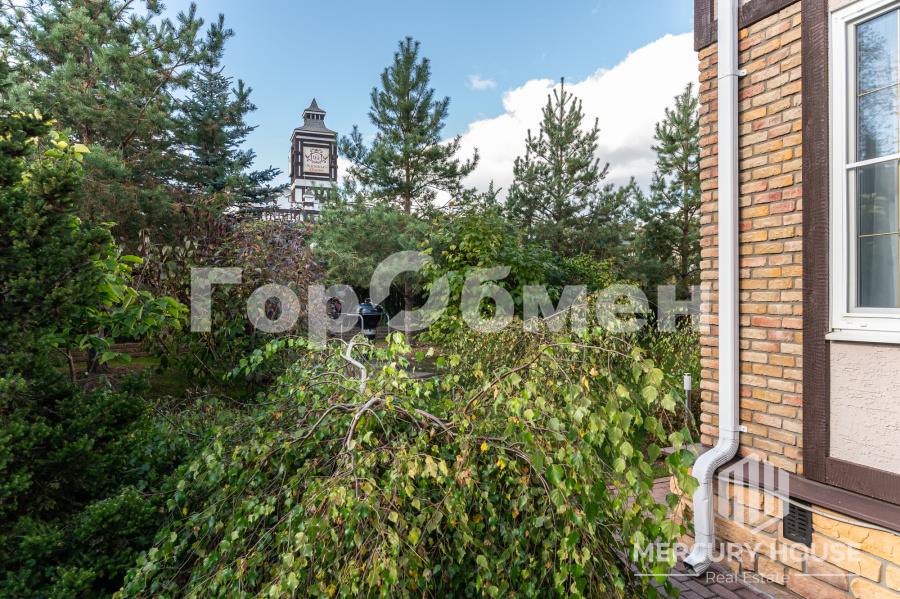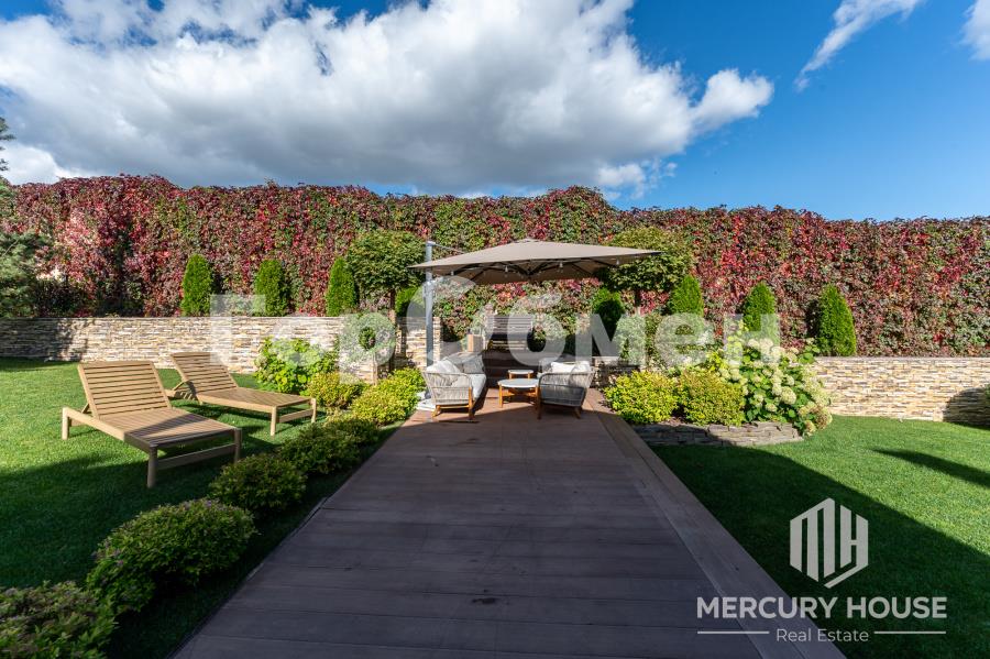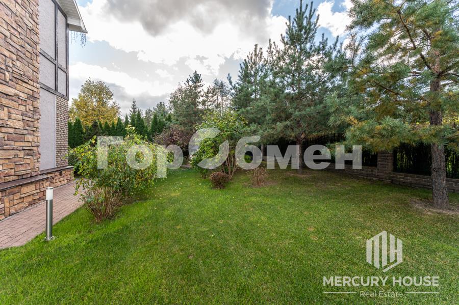 На участке выполнен КРАСИВЫЙ ЛАНДШАФТНЫЙ ДИЗАЙН: газон, множество деревьев, цветов и кустарников, дорожки из брусчатки, уличное освещение. Выделенная зона барбекю.