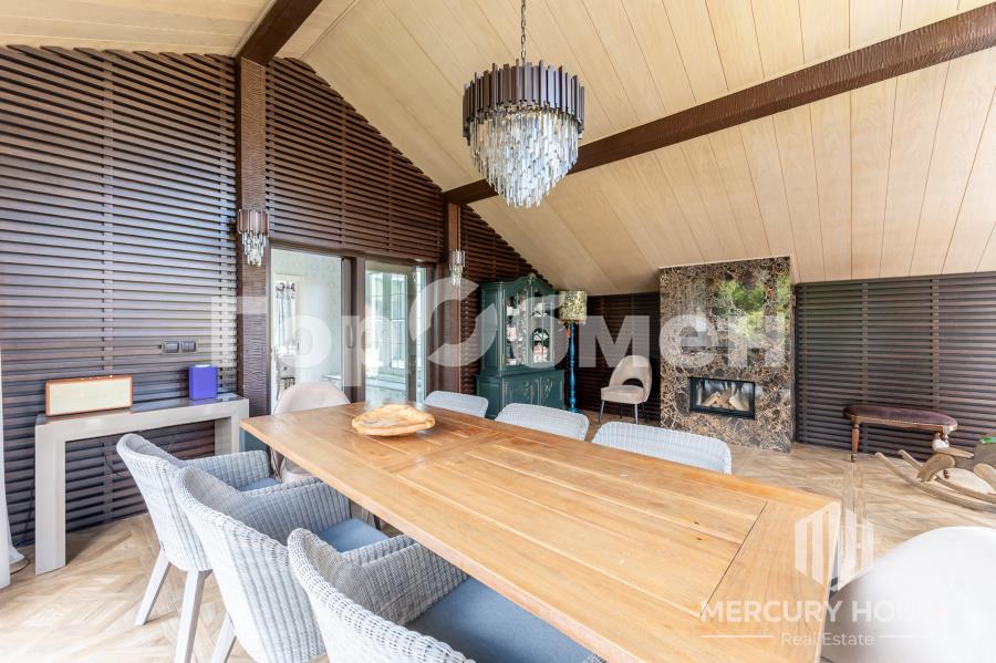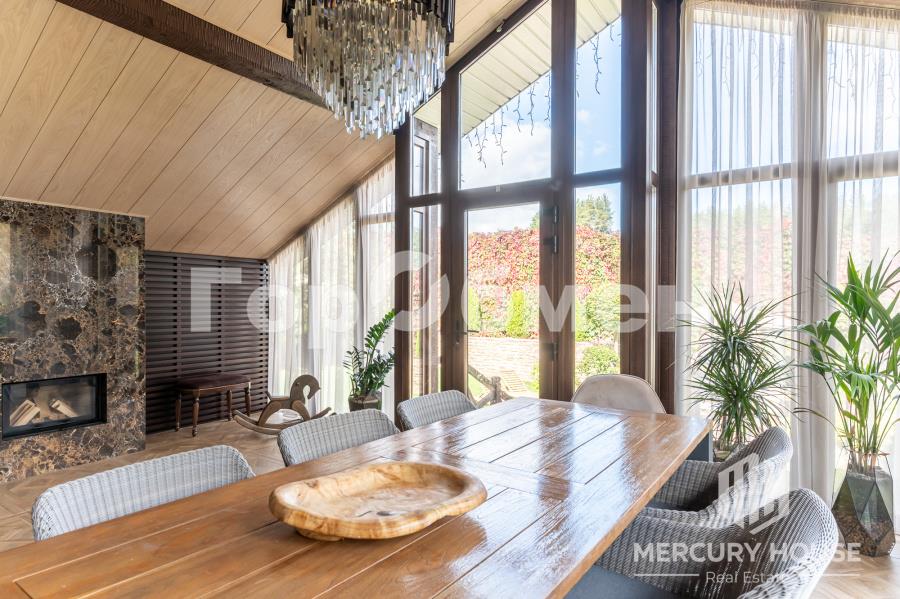 На ПЕРВОМ ЭТАЖЕ расположены: Гостиная с камином, кухонная зона и зона столовой, малая веранда, большая закрытая терраса с панорамными окнами и выходом в сад.