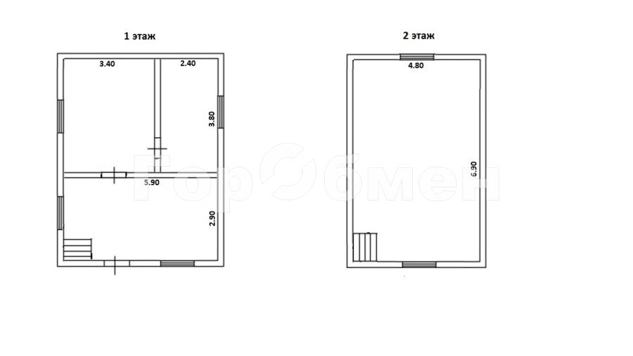 В доме на первом этаже расположена кухня и две комнаты, на втором этаже одна большая комната.