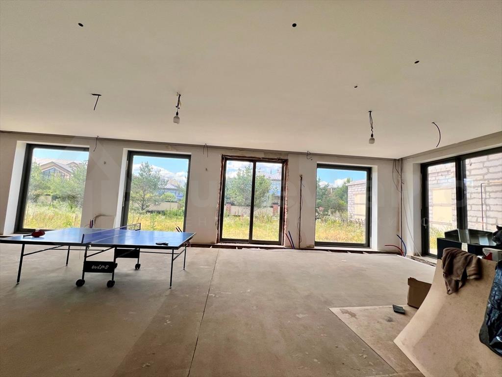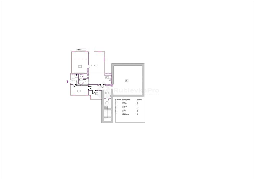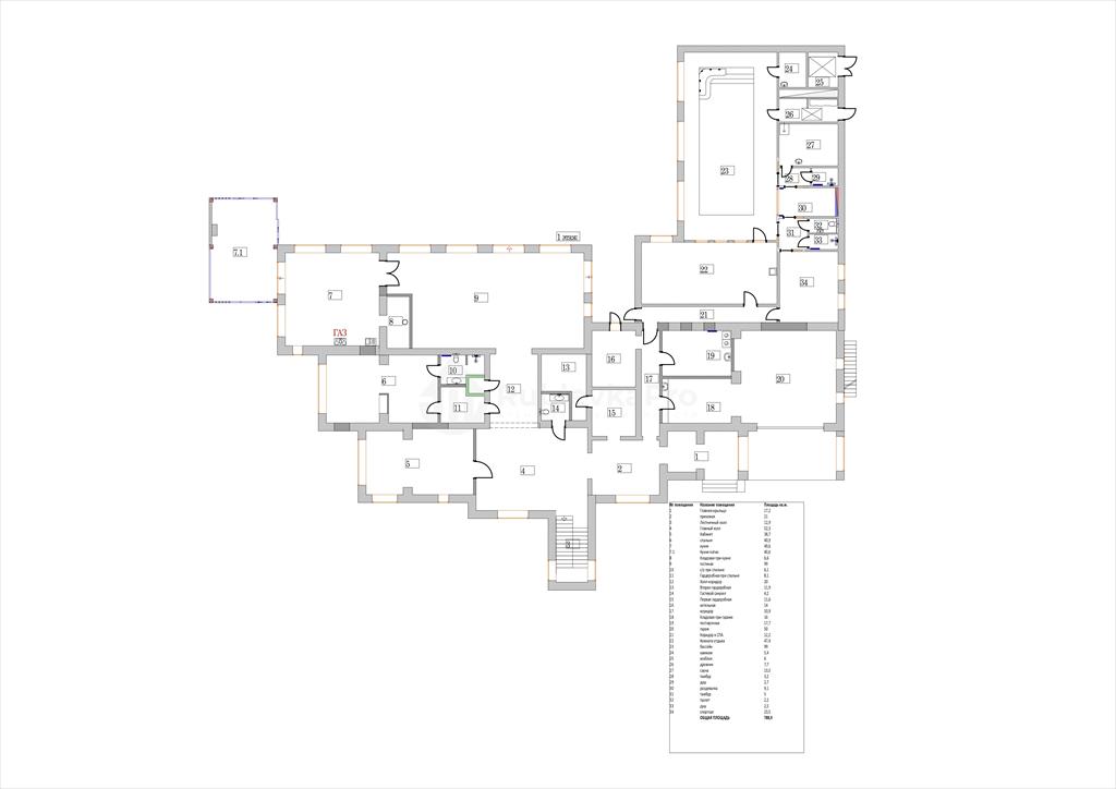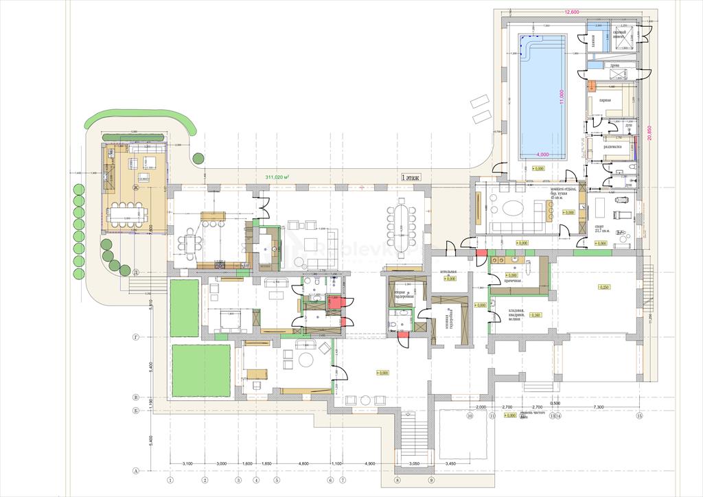 1 этаж: большой холл, лестничный холл, светлая гостиная с большими панорамными окнами с выходом на солнечный зеленый участок, кухня столовая с кладовой, кухня-патио на открытом воздухе, спальня с гардеробной санузлом, кабинет, гостевой санузел, две гардеробные комнаты, постирочная,котельная, гараж на два автомобиля с кладовой комнатой, СПА- комплекс: залита чаша бассейна, предусмотрен хамам, сауна на дровах, дровник, раздевалка, душ, санузел, спортзал, комната отдыха, кладовая. Перед гаражом навес на два-три автомобиля.