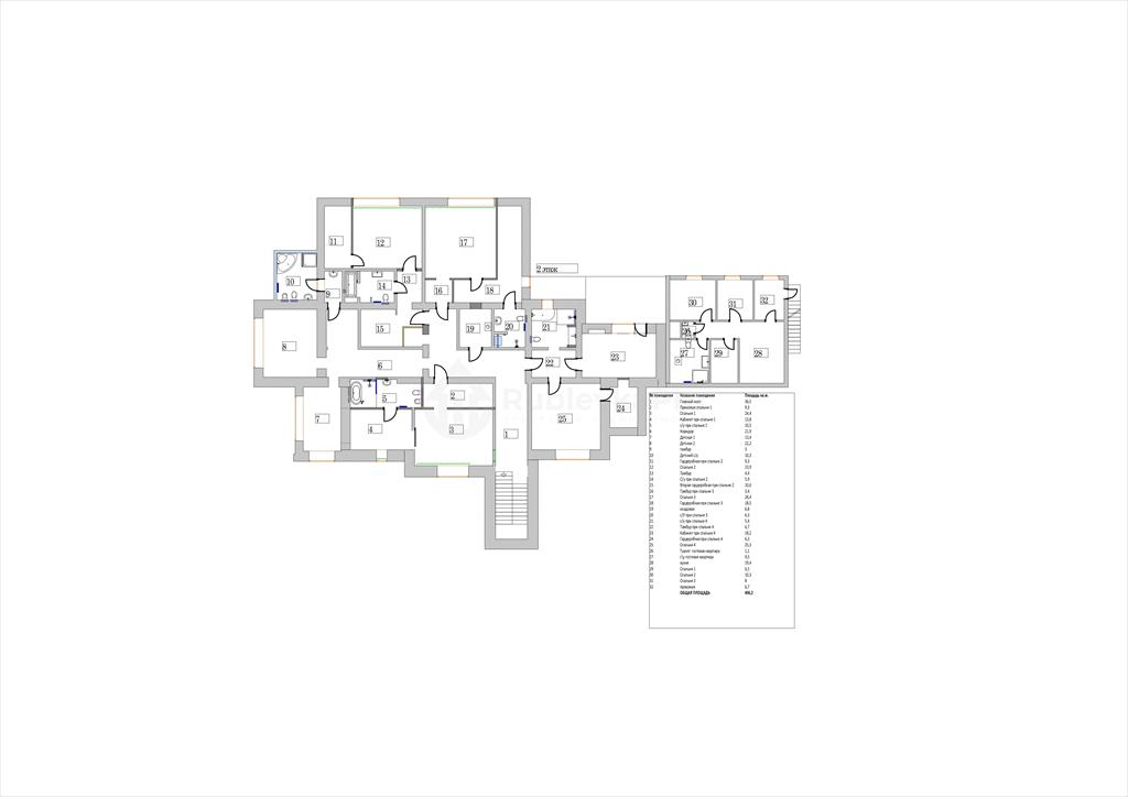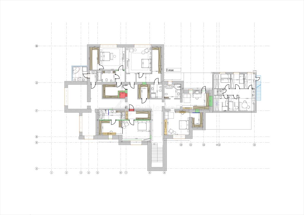 2 этаж: 4 спальни с гардеробными, кабинетами, санузлами, 2 детские спальни с санузлом и гардеробной, балкон, гостевая квартира/блок для персонала с отдельным входом: 3 спальни санузел, кухня.