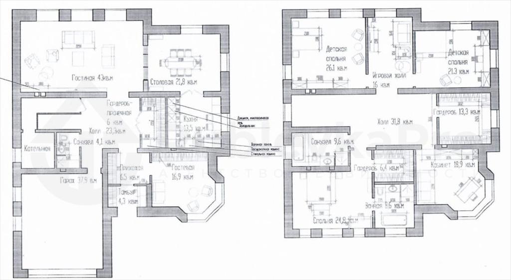 На втором этаже расположены мастер-спальня со своим санузлом и гардеробной комнатой, две детские комнаты с игровым холлом, кабинет/спальня, гардеробная комната, санузел.