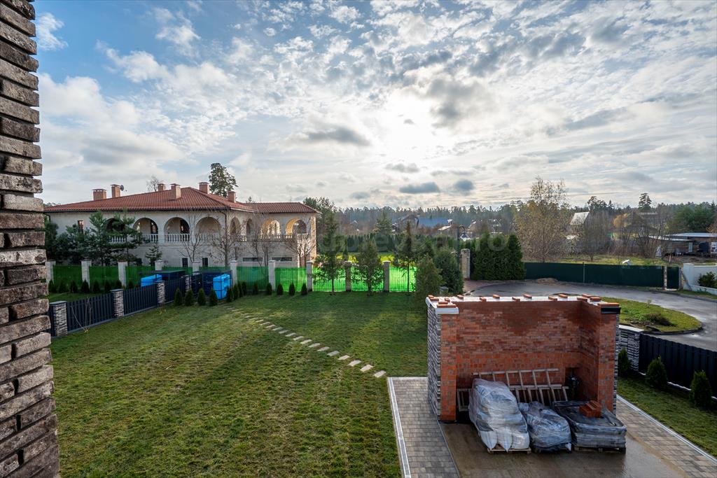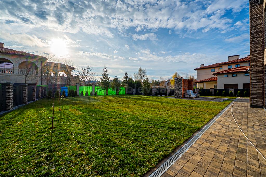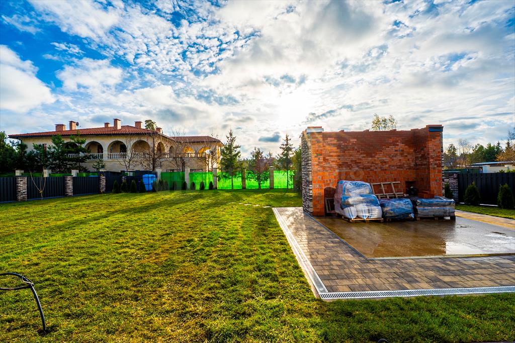 На участке проложен автополив, застелен газон, организовано место под беседку и барбекю.