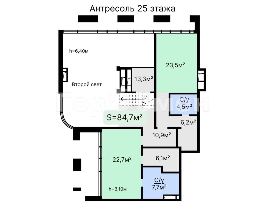 • ОБЪЕМ: Второй свет (высота 6.4 м). Антресоль уже возведена и узаконена (монолит).