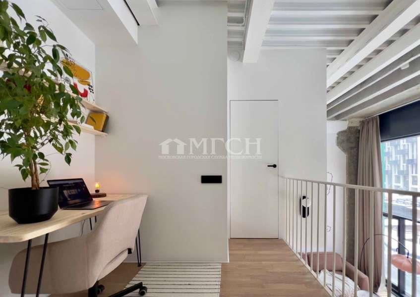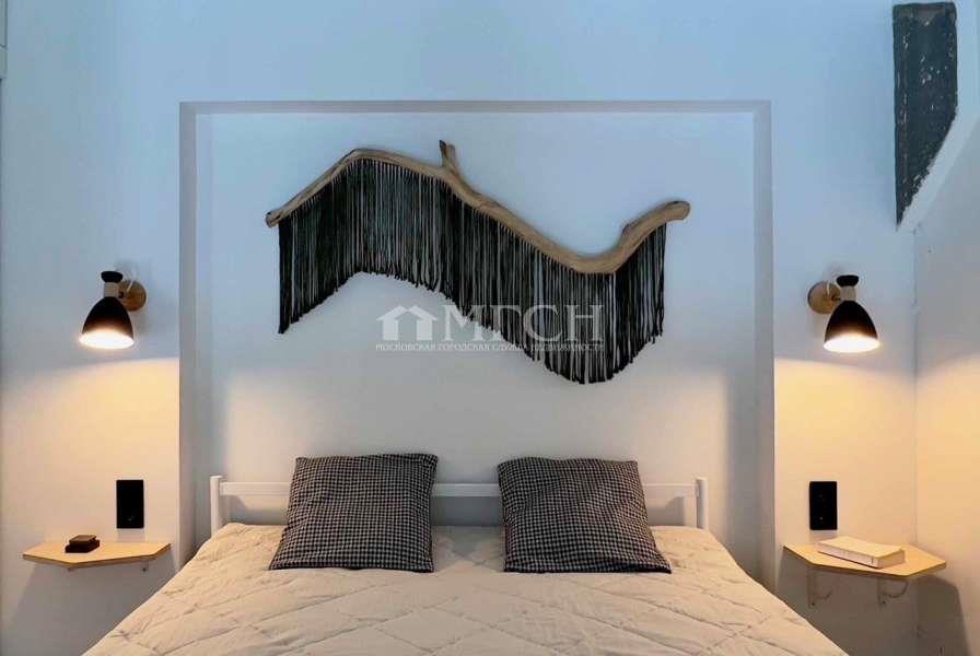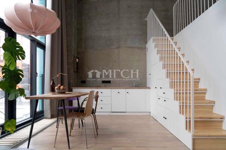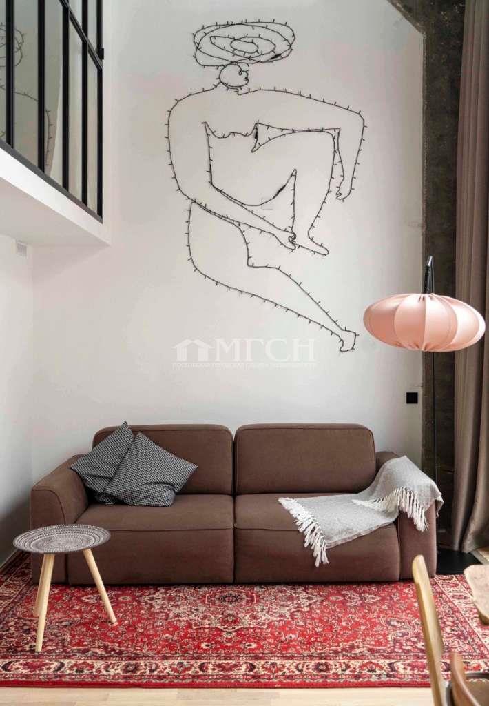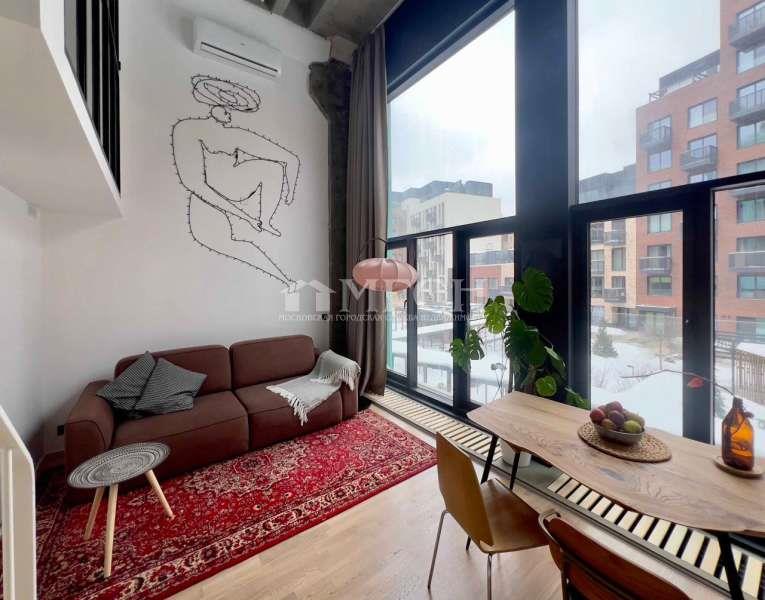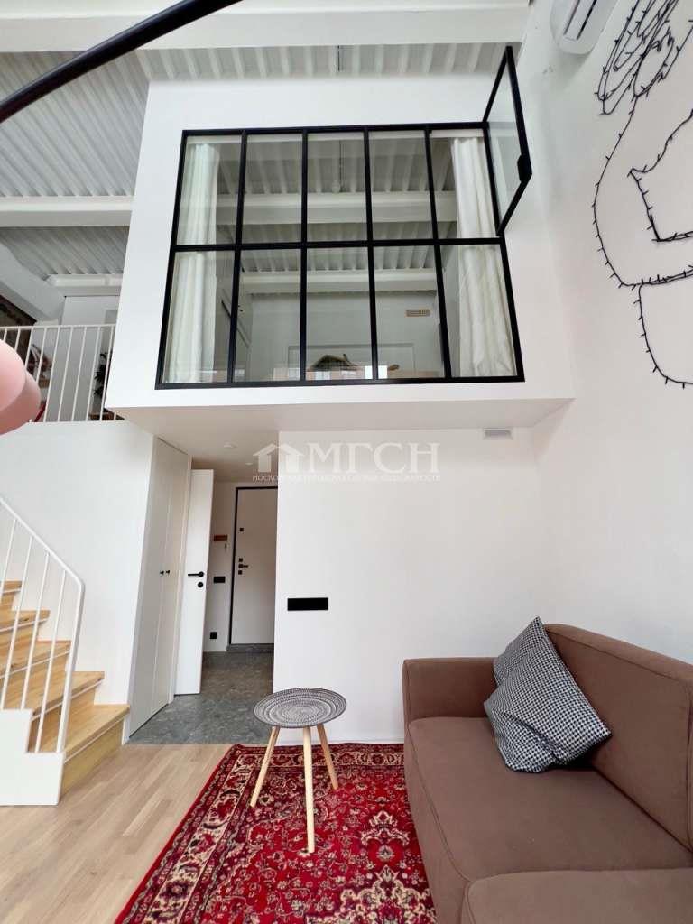 В квартира выполнен дизайнерский ремонт в стиле скандинавский лофт с панорамными окнами в пол. Общая площадь - 53м2, включая отдельную спальню (кровать 200*160), отдельную гардеробную комнату, кабинет, просторную гостиную, зону кухни и с.у. Большое светлое пространство гостиной со вторым светом имеет высоту около 5 метров.