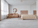 Мебель производство Италия: кровать с высоким изголовьем и матрасом, прикроватные тумбы, диван с декоративными подушками без спального механизма, стол обеденный с мраморной столешницей, полукресла облицованы кожей, тумба под ТВ.