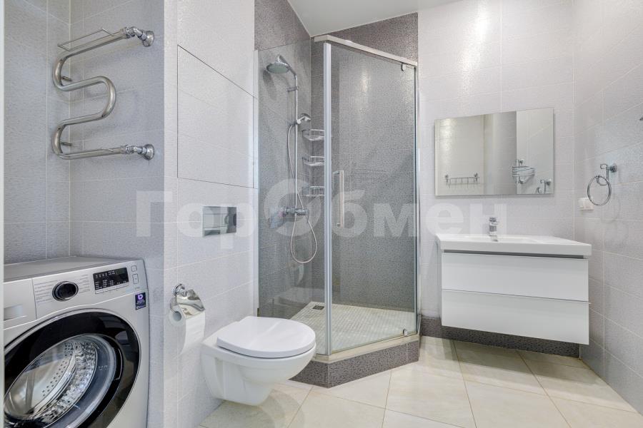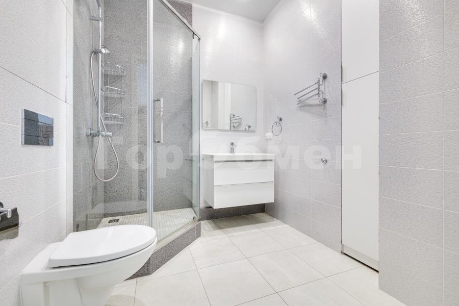Ванная комната совмещена: установлена душевая кабина с душевой системой Grohe, производство Jacob Delafon: раковина, зеркало, тумба под раковину навесная, сантехника.