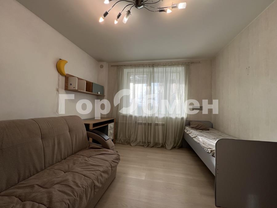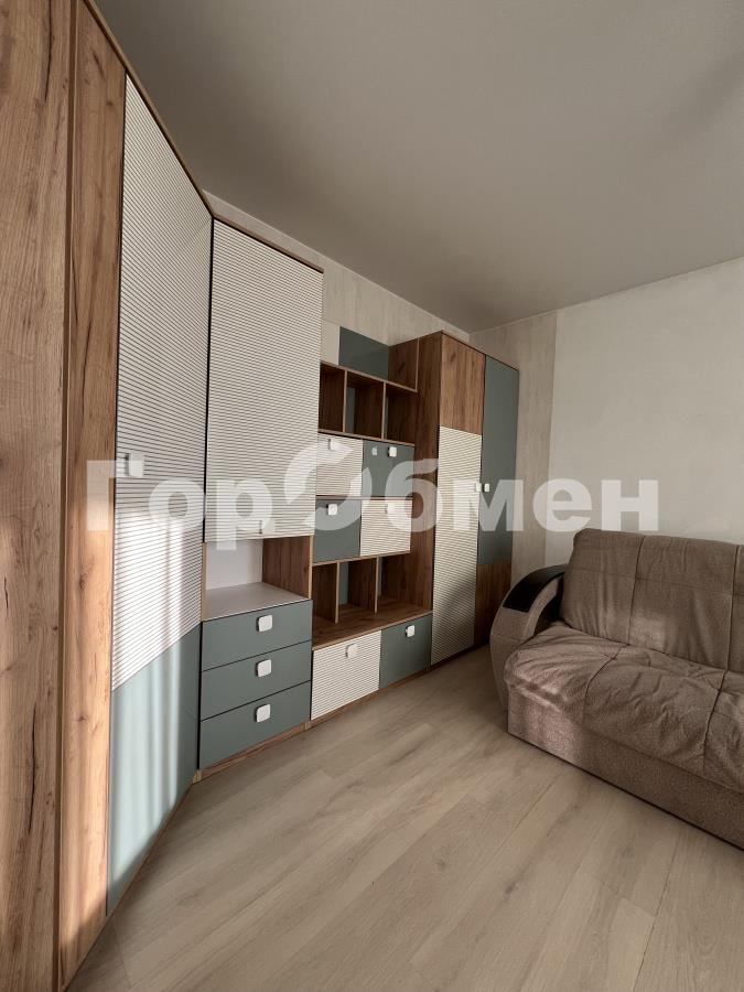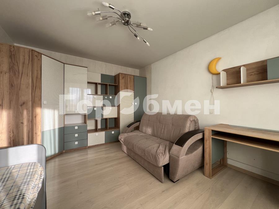 Во второй детской комнате расположена подростковая кровать, раскладной диван и вместительный шкаф во всю стену.