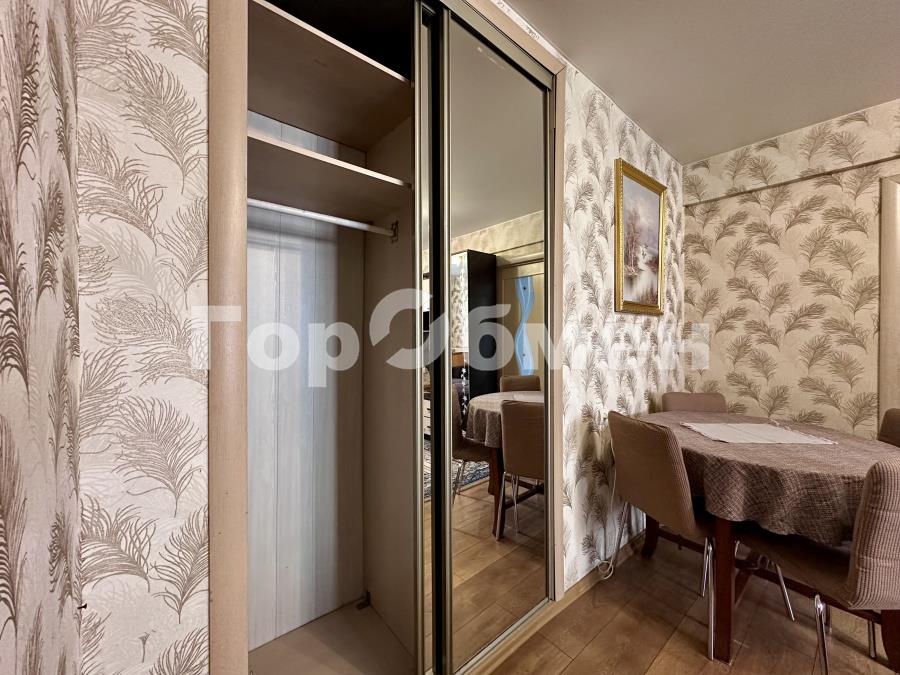 -Просторная гостиная с вместительным гардеробом, большим диваном и обеденным столом — идеальное место для семейных посиделок и приёма гостей.