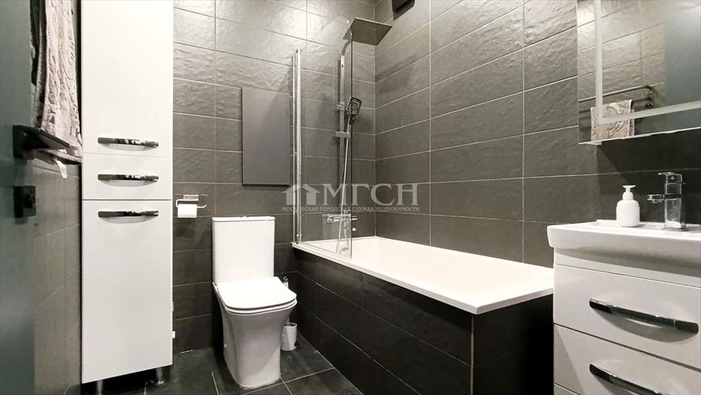 - Санузел совмещенный с полноценной ванной, тропическим душем и дополнительными местами хранения.