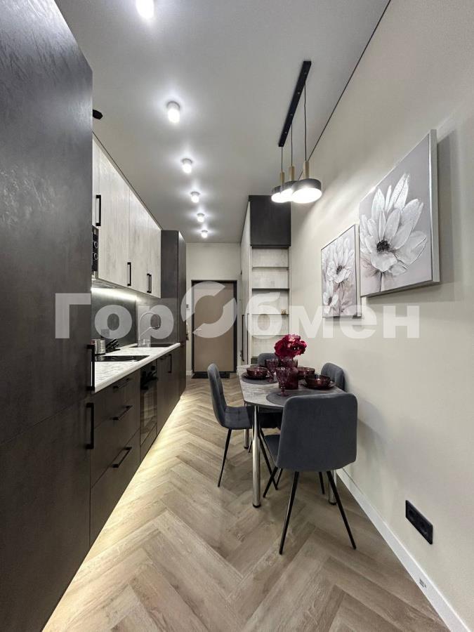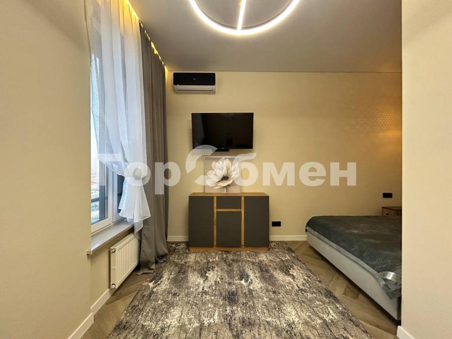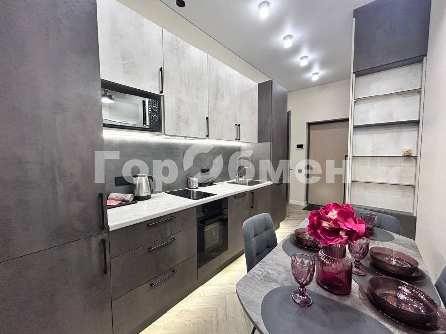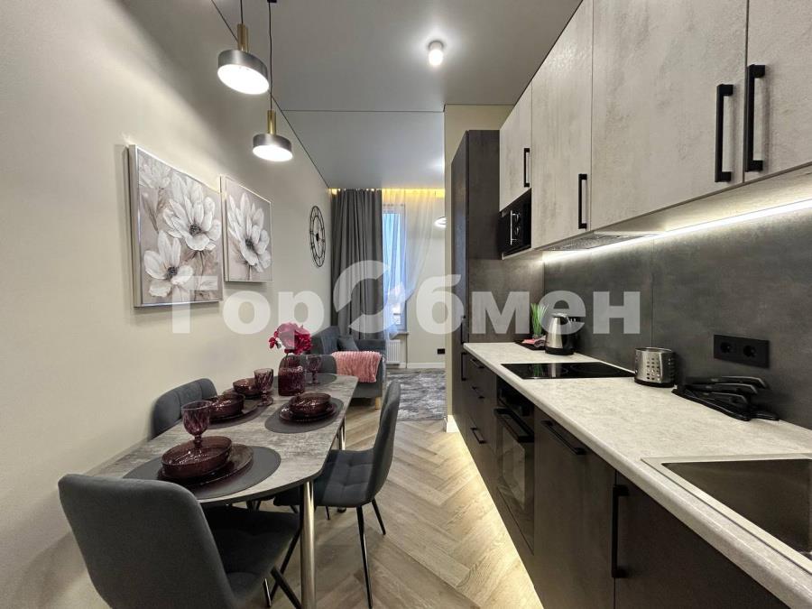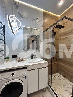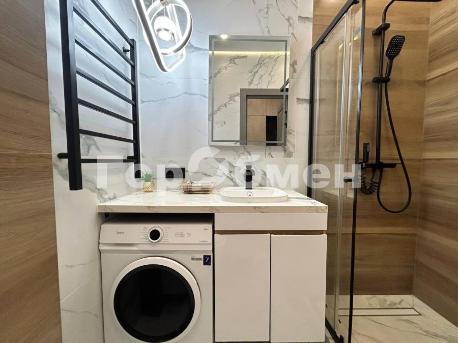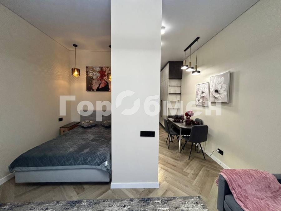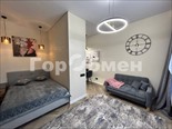 Пространство поделено на 3 зоны: кухонная зона с встроенным гарнитуром и необходимой бытовой техникой, гостиной зоной с удобным диваном, ТВ и функциональным комодом, и спальная зона с двуспальной кроватью (140*200 см). Выполнено красивое освещение. Санузел совмещён, установлена душевая кабина, всё очень стильно и гармонично.