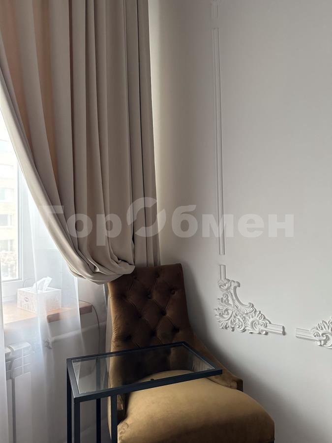 * В 1-й спальне — двуспальная кровать, гардеробная в нише, прикроватная тумбочка, туалетный столик, телевизор на стене, кресло.