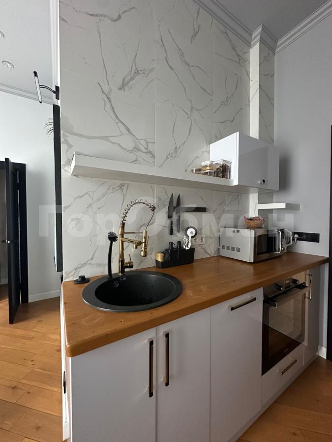 * Кухонная техника: газовая плита, духовой шкаф, посудомоечная машина, микроволновая печь, измельчитель пищевых отходов на раковине.